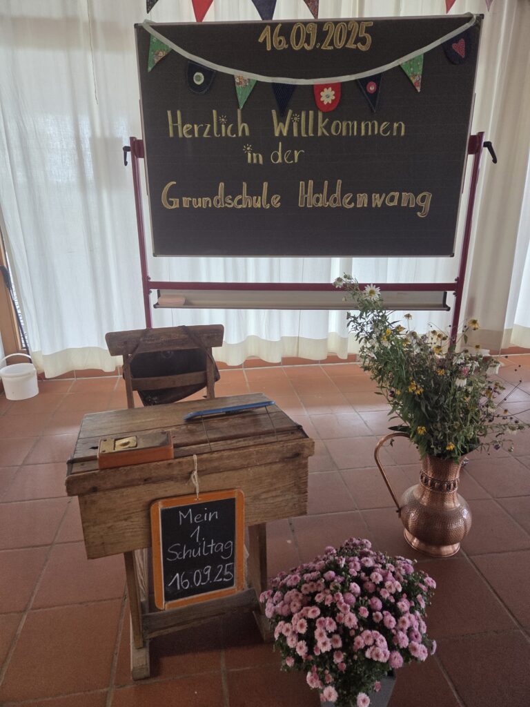 Am ersten Schultag herrschte auf dem Pausenhof der Grundschule Haldenwang gespannte Aufregung. Bunte Schultüten, blitzende Augen und ein bisschen Lampenfieber – die neuen Erstklässler wurden feierlich begrüßt. Unser Bürgermeister Josef Wölfle ließ es sich nicht nehmen, die frischgebackenen ABC-Schützen persönlich willkommen zu heißen und wünschte allen viel Freude beim Lernen. Auch der Schulleiter Herr Sturm und die Konrektorin Frau Schmid-Brunk hießen alle Gäste herzlich willkommen und wünschten unseren ABC-Schützen einen guten Schulstart. Unsere Elternbeiratsvorsitzende Frau Wilhelm und Frau Friedrich, die Leiterin der Mittagsbetreuung begrüßten ebenfalls unsere Gäste.