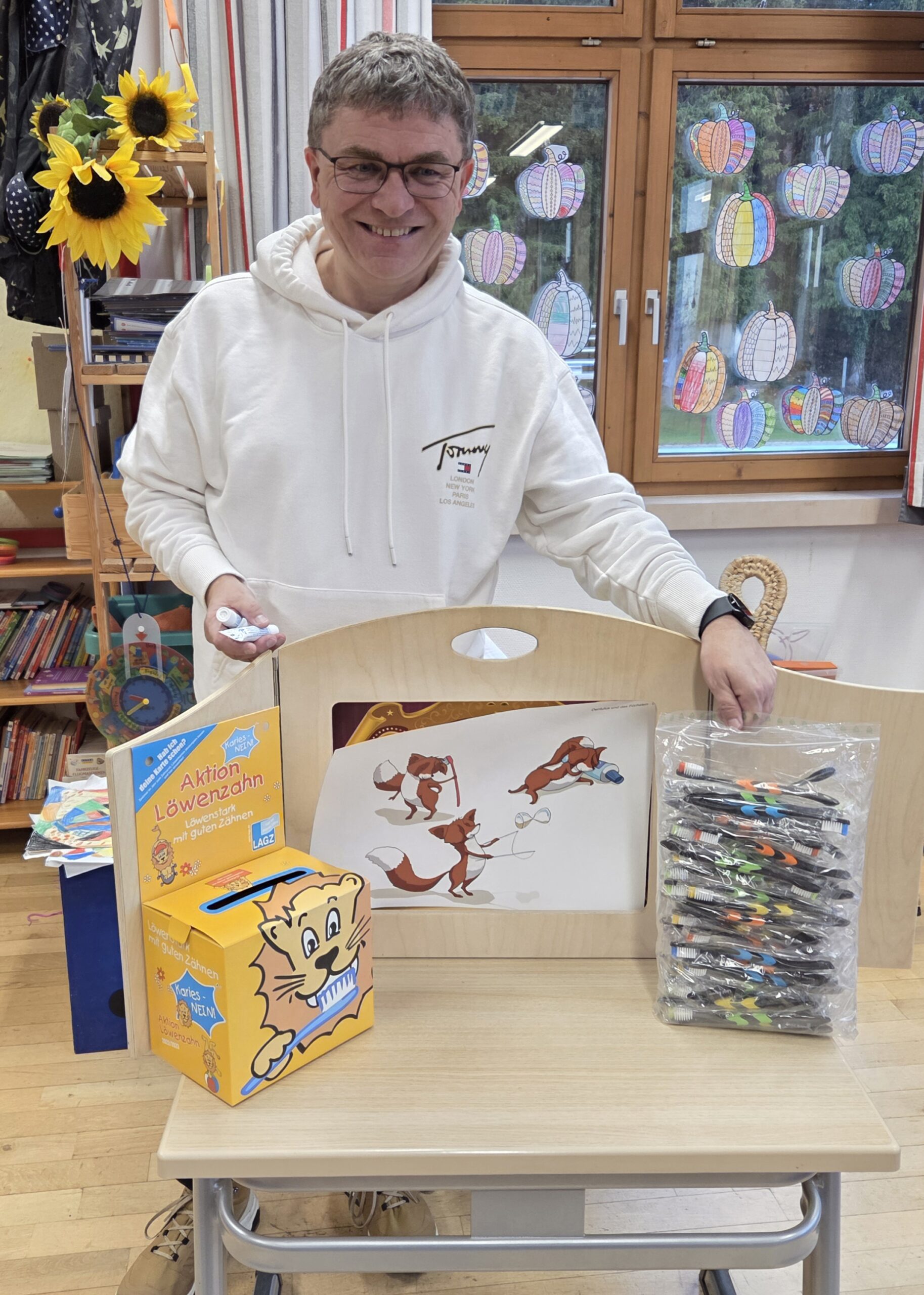 Große Aufregung in der Grundschule Haldenwang: Schulzahnarzt Dr. Pelczer war zu Besuch – und er kam nicht mit leerem Gepäck! Stattdessen brachte er ein wunderschönes Bilderbuch mit, in dem Dentulus, der mutige Löwe und der kleine Fuchs beim Zahnarzt vorbeischauen. Gemeinsam mit den Kindern tauchte Dr. Pelczer in Dentulus’ Abenteuerwelt ein und erklärte spielerisch, warum Zahnpflege so wichtig ist. Die Kinder hörten gespannt zu – und lachten herzlich über die vielen unterhaltsamen Episoden.